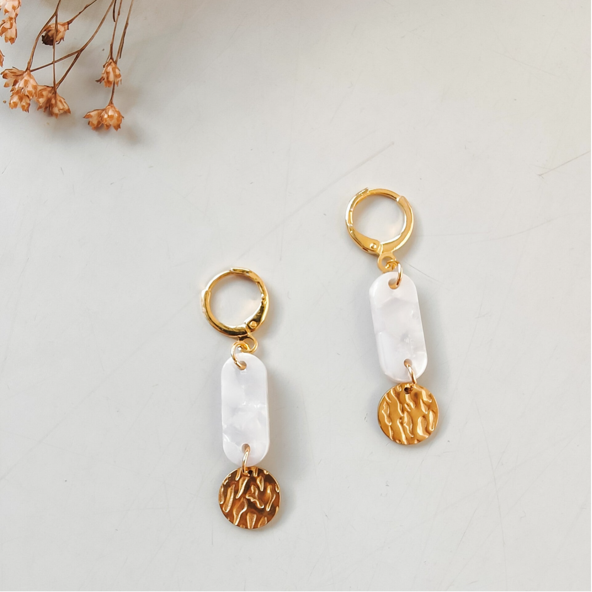 Vergulde oorhaakjes met gevlekte acrylbedel in wit + roestvrij stalen schijfje.